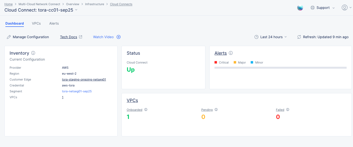 The Cloud Connect dashboard looks at one of your Cloud Connects and provides an overview of the Cloud Connect's inventory, status, alerts, and VPC states.